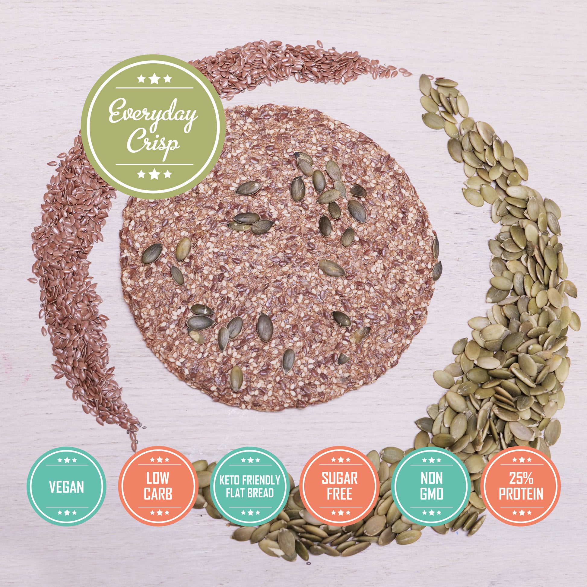 Ingrediener: Linfrö*, SESAMFRÖ*, KRUSKAKLI* (av VETE), pumpafrö*, psylliumfröskal* och salt. Kan innehålla spår av mandel, hasselnötter, paranötter, pekannötter, ägg och mjölk. Fri från palmolja. *Ekologisk ingrediens.